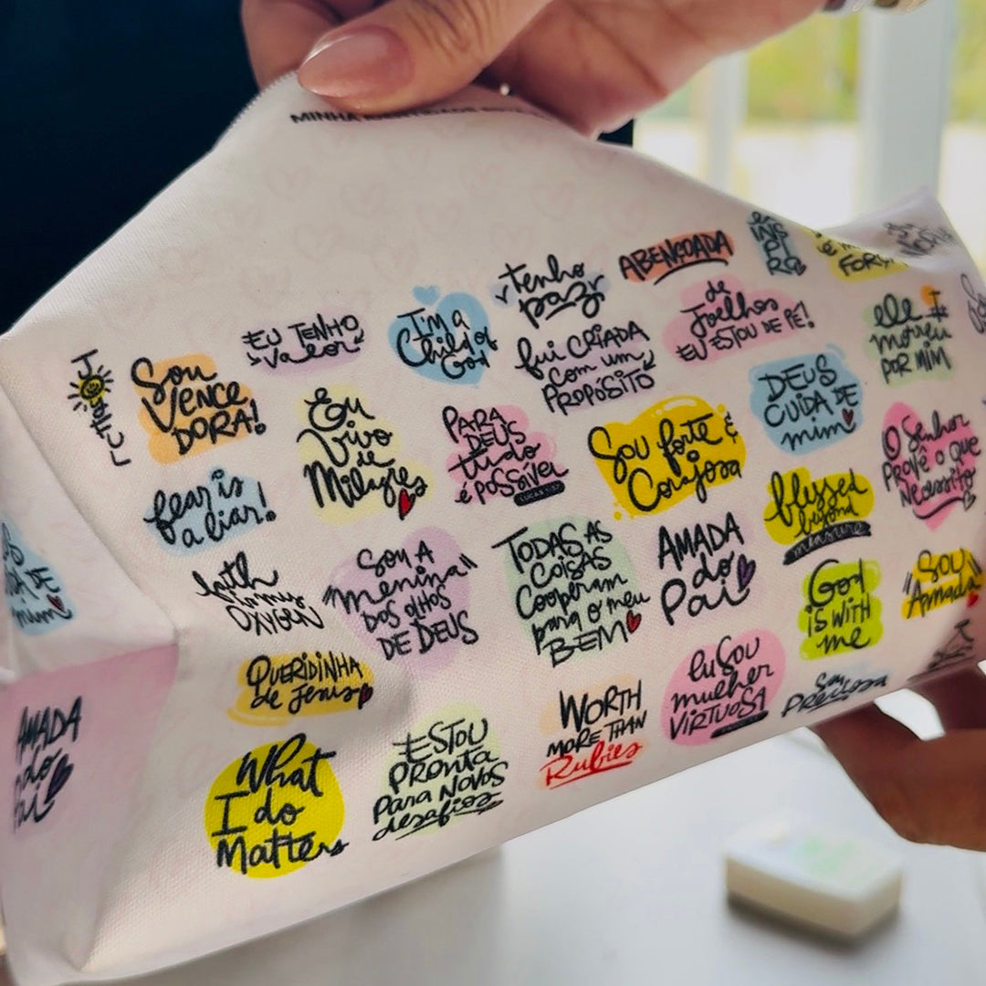 Cheio das frases tão inspiradoras que exaltam a Identidade da Mulher em Cristo, essa bolsinha colorida e elegante vai transformar seus dias!